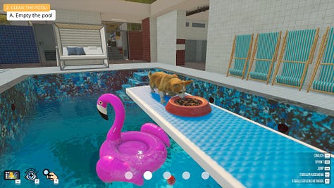 Les joueurs et joueuses peuvent alors divaguer et prendre le temps de sâinitier Ă la mise en scĂšne, en proposant Ă de mignons corgis de prendre leurs repas sur un plongeoir glissant ou encore de profiter du lore dĂ©gĂ©nĂ©rescent du jeu qui, bien Ă©videmment, fini par âcapitaliserâ sur le malaise provoquĂ© par lâabondance de canards, de bouĂ©es et de cygnes gonflables et goofy qui deviennent angoissants.