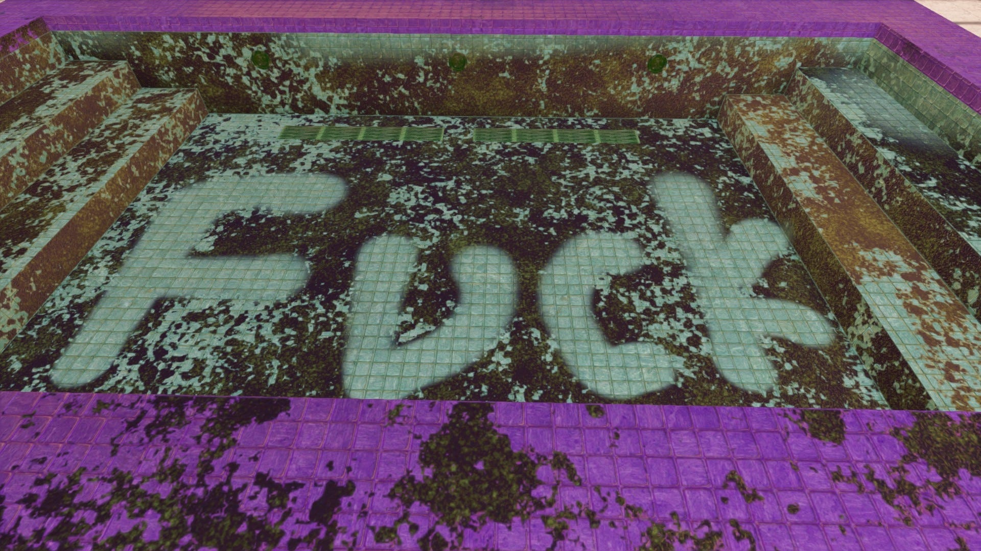Le systĂšme social et politique, câest un peu un genre de pĂ©diluve. Câest un bac dâeau Ă moitiĂ© dĂ©gueulasse rempli dâesbrouffe, dans lequel les gens font semblant de laver leurs mycoses alors quâon sait trĂšs bien quâil y a tellement de chlore sur le carrelage que ça sert Ă rien, mais ça donne aux gens lâillusion dâĂȘtre propres. Câest cette mĂȘme ironie que je retrouve dans le âFUCKâ quâa gravĂ© le joueur Steam Duckey1230 au karcher sur le carrelage dâune piscine quâil Ă©tait sensĂ© nettoyer pour gagner du fric.