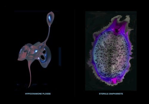 Lâessence mĂȘme de ses crĂ©atures est impalpable. En rĂ©inventant des termes aux inspirations brumeuses, Louis Bec va Ă lâencontre de lâessence mĂȘme du paradigme scientifique et biologique de lâĂ©poque. CrĂ©atures informes, trompeuses, ou encore aux contours incertains, ces nouveaux ĂȘtres sont aussi vaporeux et insaisissables que les termes qui servent Ă les dĂ©finir. Le sfumato, par exemple, est un procĂ©dĂ© de peinture, trĂšs prĂ©sent dans la peinture Italienne, qui consiste Ă utiliser des contours vaporeux, Ă brouiller les bords des formes reprĂ©sentĂ©es de maniĂšre âbrumeuseâ. Cette existence liminale nâest pas sans rappeler lâabondance des musiques âslowed and reverbedâ que lâon peut trouver sur Youtube ou Spotify. Des musiques sont ralenties et nimbĂ©es dâĂ©chos, dans un procĂ©dĂ© rapide et reproductible Ă lâinfini qui teinte de mĂ©lancolie et dâĂ©sotĂ©risme nâimporte quel track pop en quelques minutes. Câest possible de slow and reverb nâimporte quelle track ici: https://slowedandreverb.studio/ (il y a aussi un Nightcore track generator).